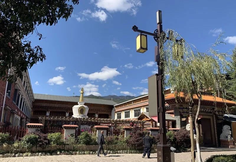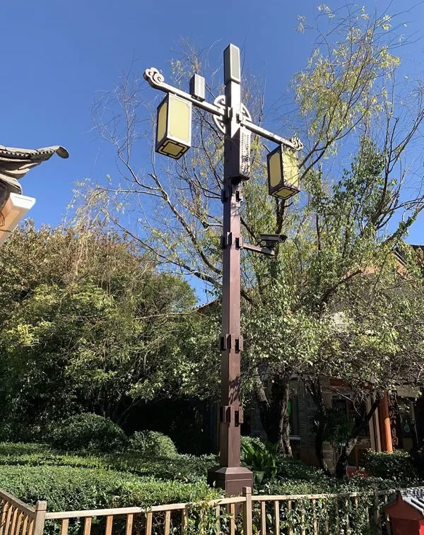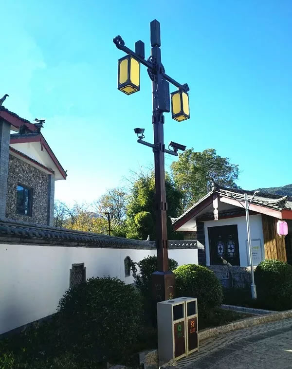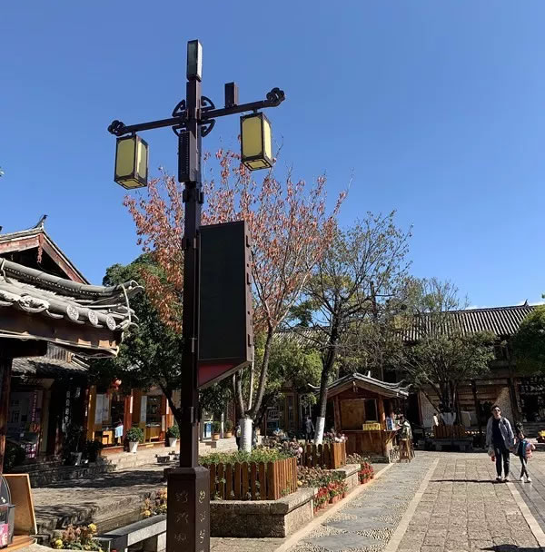束河古镇是纳西先民在丽江坝子中最早的聚居地之一,是茶马古道上保存完好的重要集镇,古镇中保留着许多古民居。智慧灯杆的进入无疑给这样的古镇增添了一抹别样的风情,给古镇带来了科技感,进驻的智慧灯杆既要考虑性能又要考虑与古镇风格的整体划一,既不破坏古镇景致,又能锦上添花,中国风灯杆造型的诞生完美解决了这一难题。
