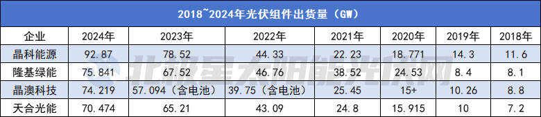 这一格局自2018年后便稳定至今,虽排位会有上下浮动,但四家企业无一缺席,四大组件寡头无可争议。七年间,四大巨头的年度组件出货量也由不足10GW狂飙至70GW+甚至直追百吉瓦。